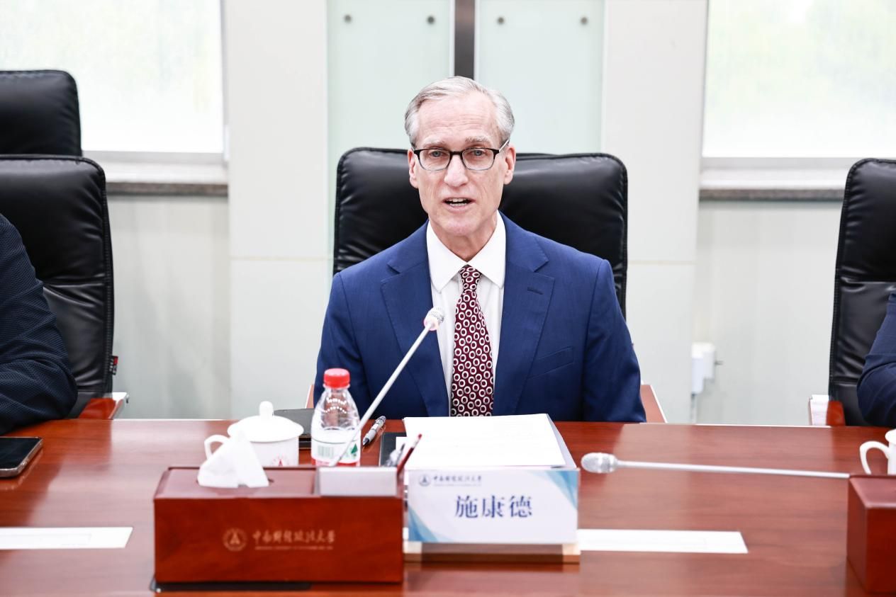 施康德对学校的热情接待表示感谢,并简要介绍了南方大学的历史、优势学科和人才培养情况。他表示,中南财经政法大学在师资建设、科研能力、人才培养、行政管理等方面所展现的专业性和卓越性给他留下了深刻的印象。他指出,在当前的国际形势下,中美两国的关系正面临若干挑战与难题,更加凸显了中美教育领域交流与合作的重要性。两国的高等教育机构应当承担起更大的责任,通过加强教育交流与合作,共同推动中美关系朝着更加积极和建设性的方向发展。他坚信两校的合作必将取得圆满成功。