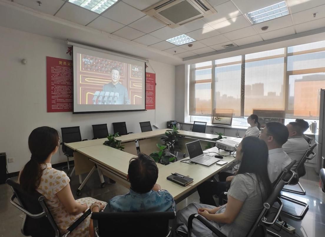 上午9时整,报时钟声响起,纪念大会开始。大家全神贯注、认真聆听习近平总书记在大会上的重要讲话。习近平强调,中华民族伟大复兴势不可挡!人类和平与发展的崇高事业必将胜利!深深感召着每一位党员同志,让大家心中激荡起强烈的历史责任感与使命担当。阅兵仪式环节,威武帅气、整齐划一的徒步方队迈着铿锵步伐通过,战旗方阵承载着历史荣光浩荡而来,现场不时响起阵阵掌声,大家深切感受到国家发展的磅礴力量,倍感振奋。